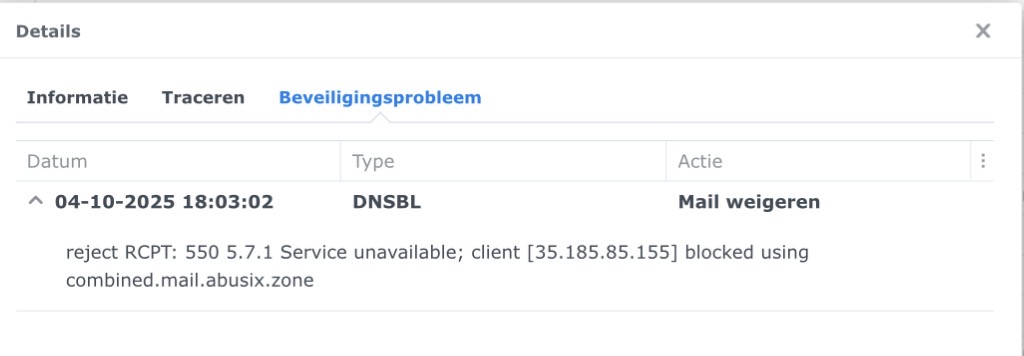 When you add an RBL host with a license key in the hostname to your Synology MailPlus Server configuration. Such as the excellent Abusix Combined list. The key is reported to the attacker in the SMTP rejection message. You don’t want to share that private credential with anyone, let alone a rogue entity.