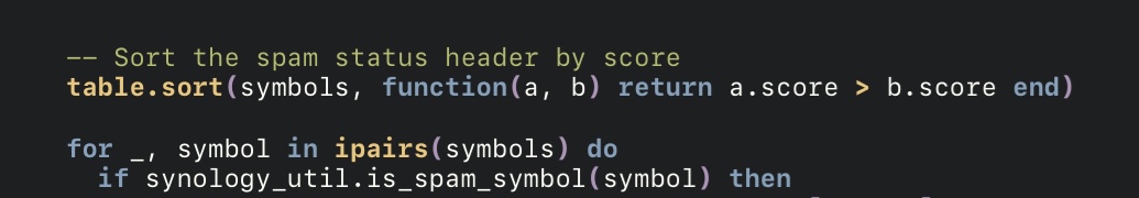 By default the contents of the X-Synology-Spam-Status header are unsorted. Making it difficult to understand why a certain mail is flagged as spam or ham. Here is a tweak to sort the header by score.